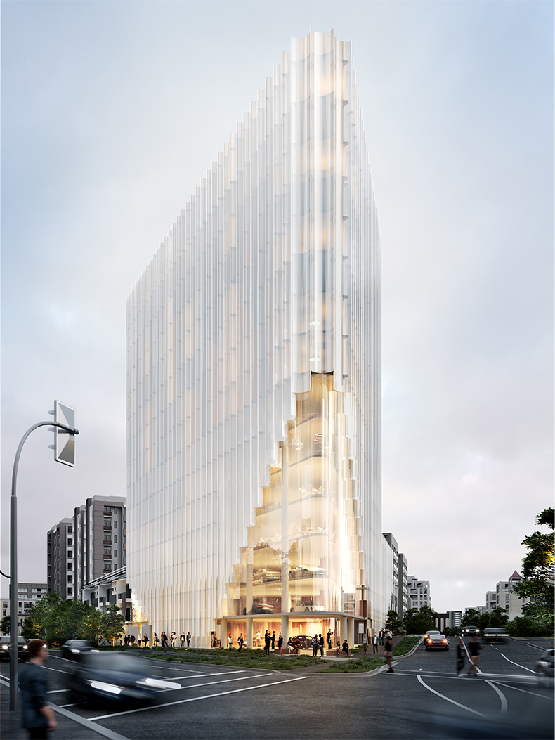 Internal lighting is positioned in a formulaic sequence behind milky glass, within an interchangeable arrangement, to create further visual interest. design—matches the feature fritted glazing and provides a continuous sculptural form.