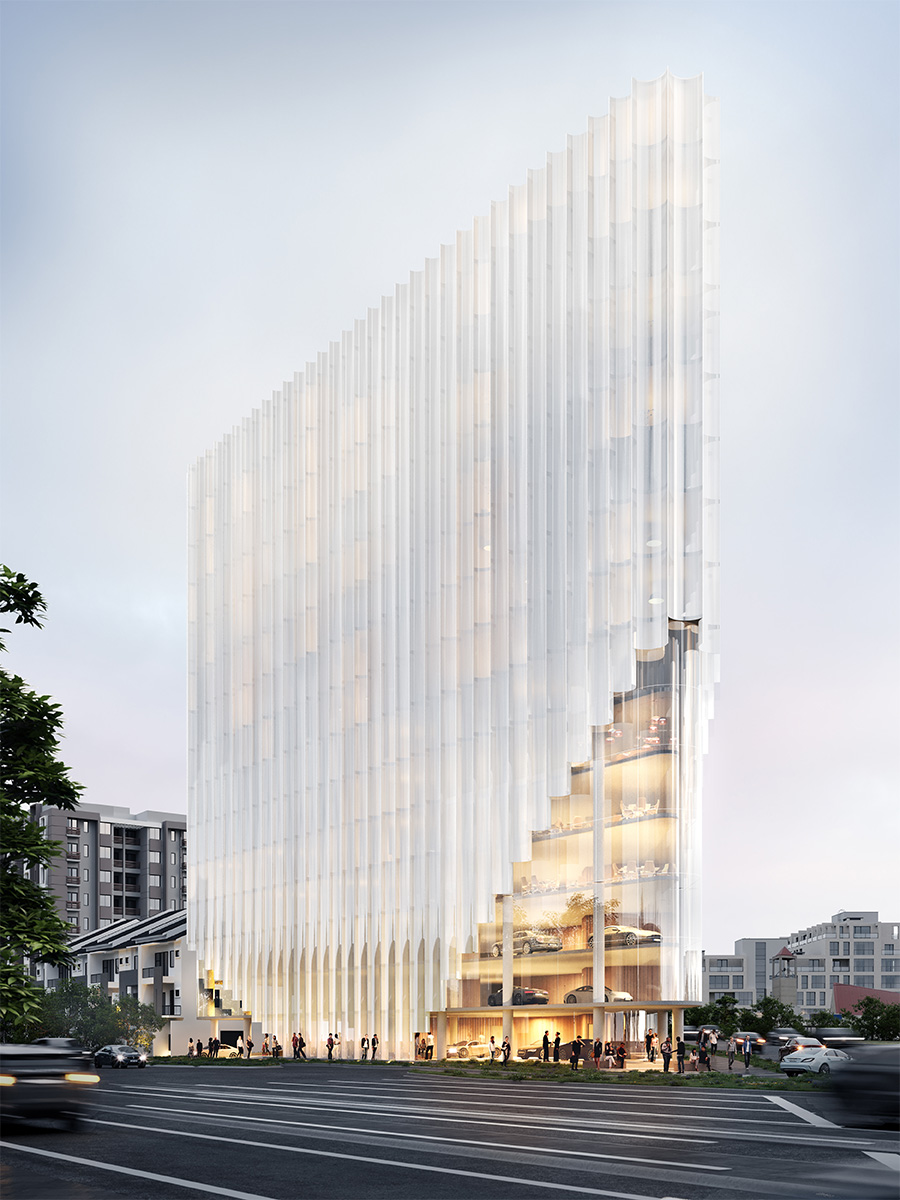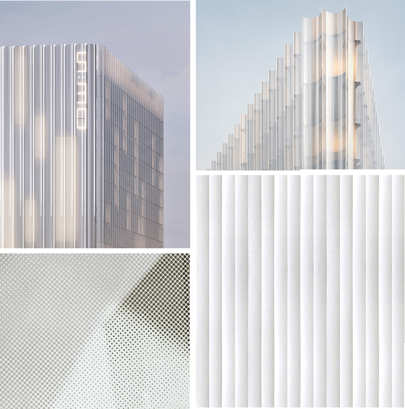 The use of fritted glass provides the desired soft milky look while helping reduce glare, cut cooling costs and lower the danger to birds. The white appearance helps to further soften the built form, while the aluminium—shaped to a scallop design—matches the feature fritted glazing and provides a continuous sculptural form.