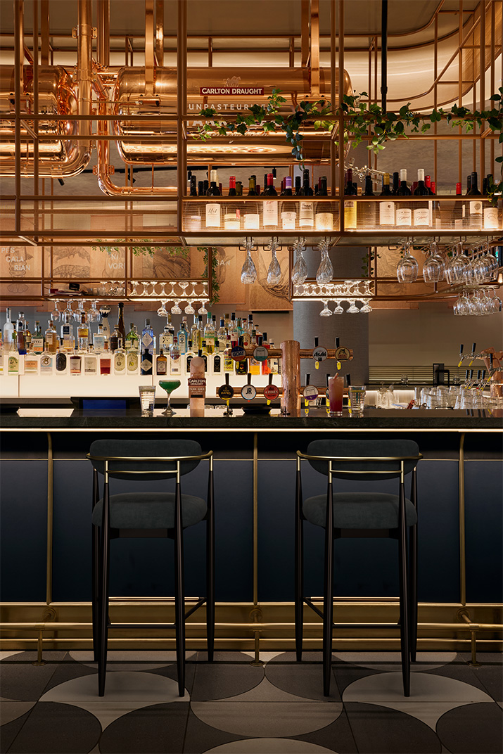 A classic, yet ultra-contemporary bar featuring distinct references to the brewing process via bold copper beer tanks and highlights.